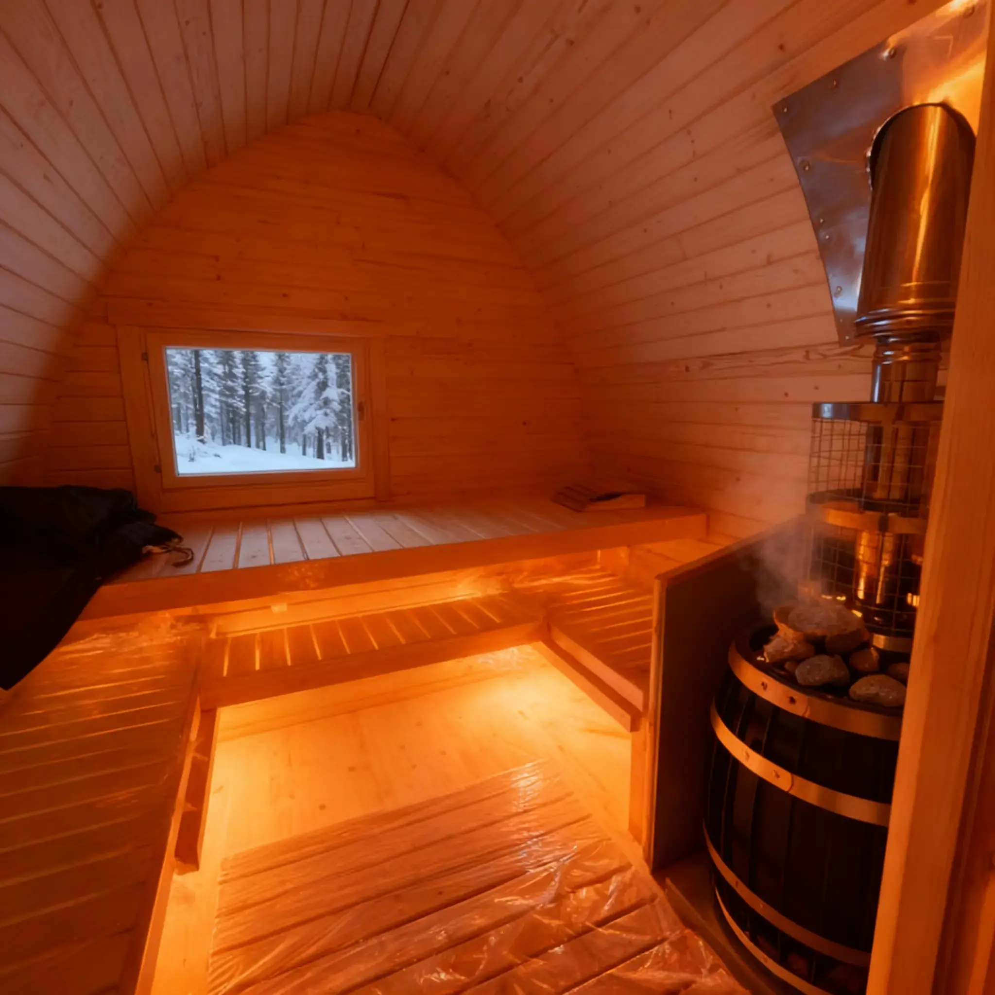 Топка внутри парной. Классика жанра: вы подкидываете дрова, не отрываясь от процедур, и наблюдаете за игрой огня через стекло печи прямо в парилке.